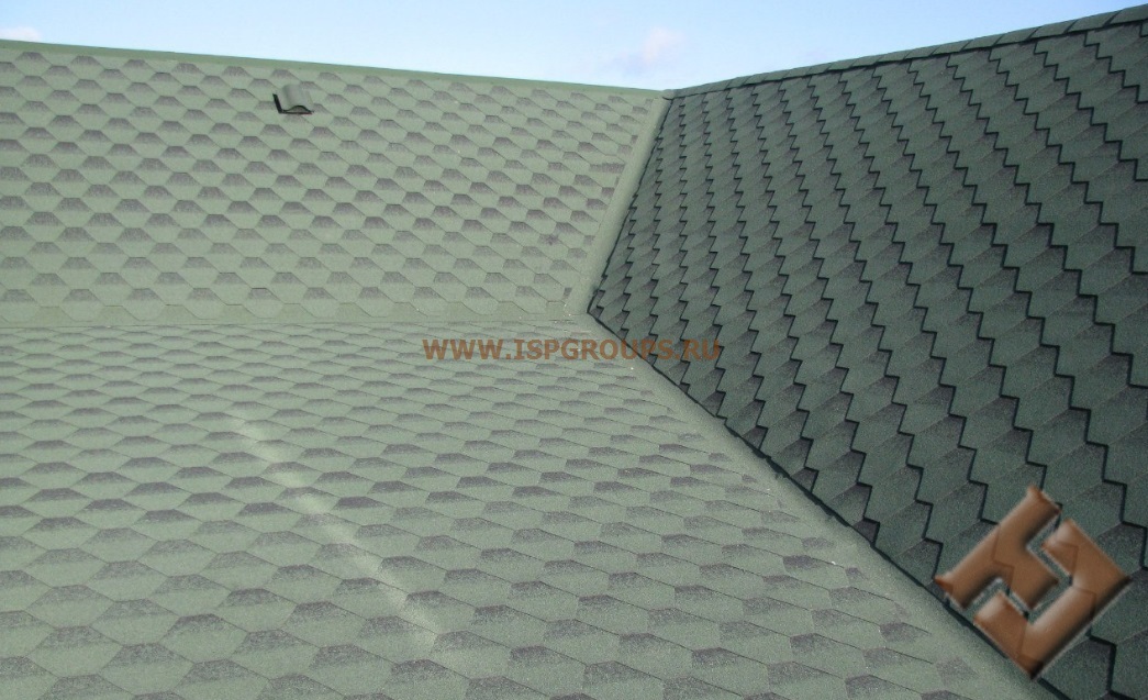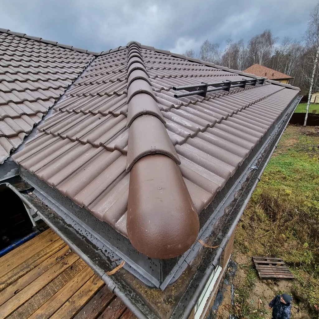 • Монтаж коньковых элементов крыши. На линии стыка скатов закрепляются коньковые планки. Укладываются детали внахлест так, чтобы следующий элемент перекрывал место закрепления предыдущего. Фиксируется коньковая черепица в четырех точках – по две на каждую из сторон.